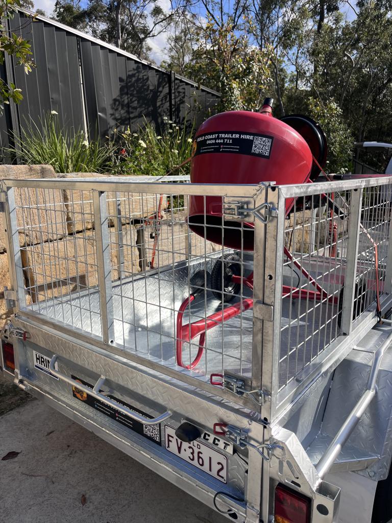 The Premium Trailer with high sides is available for hire in 6 x 4 size with optional cage and concrete mixer and is rated to 750kg ATM.  Features include: